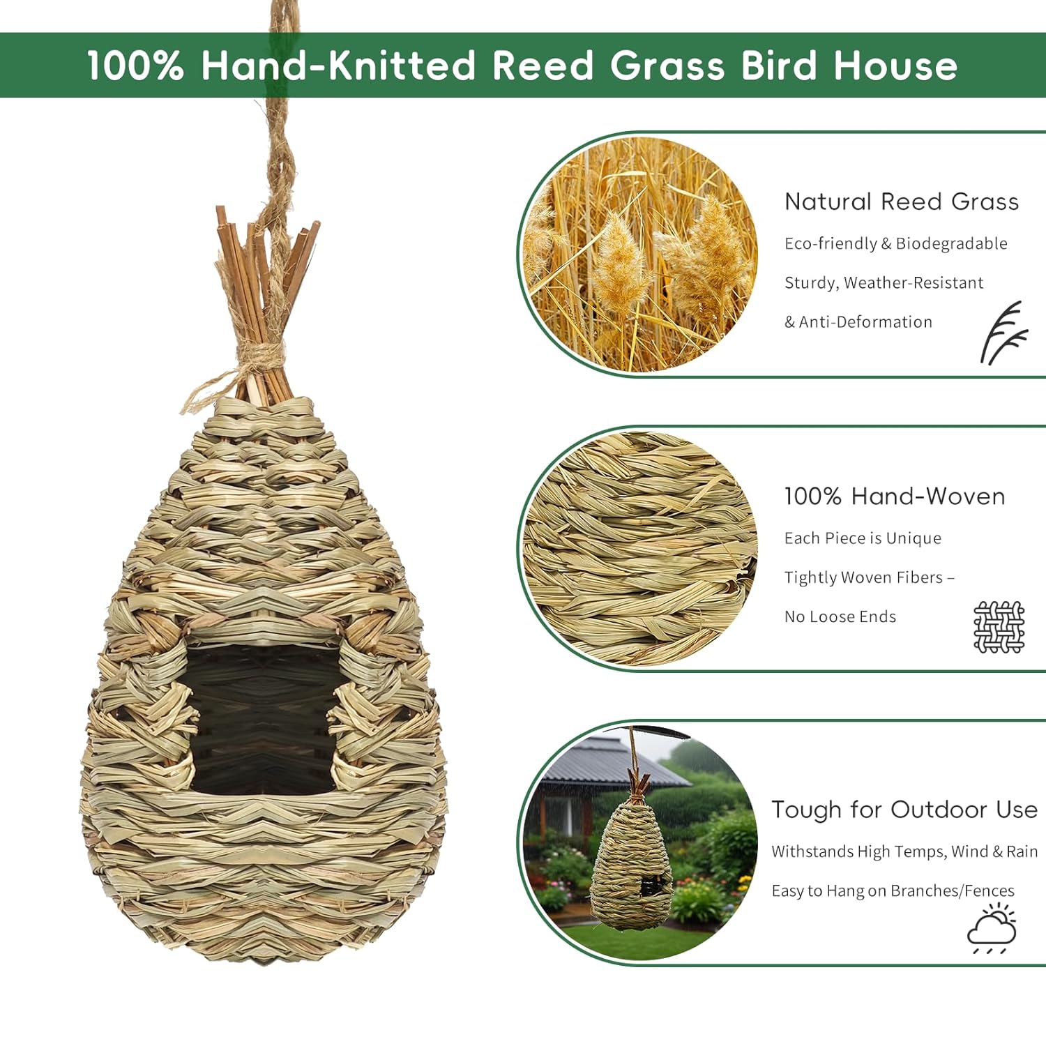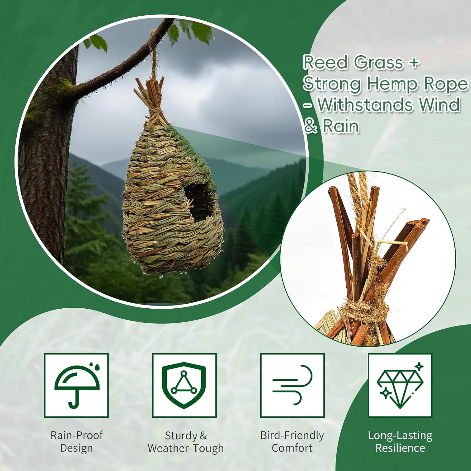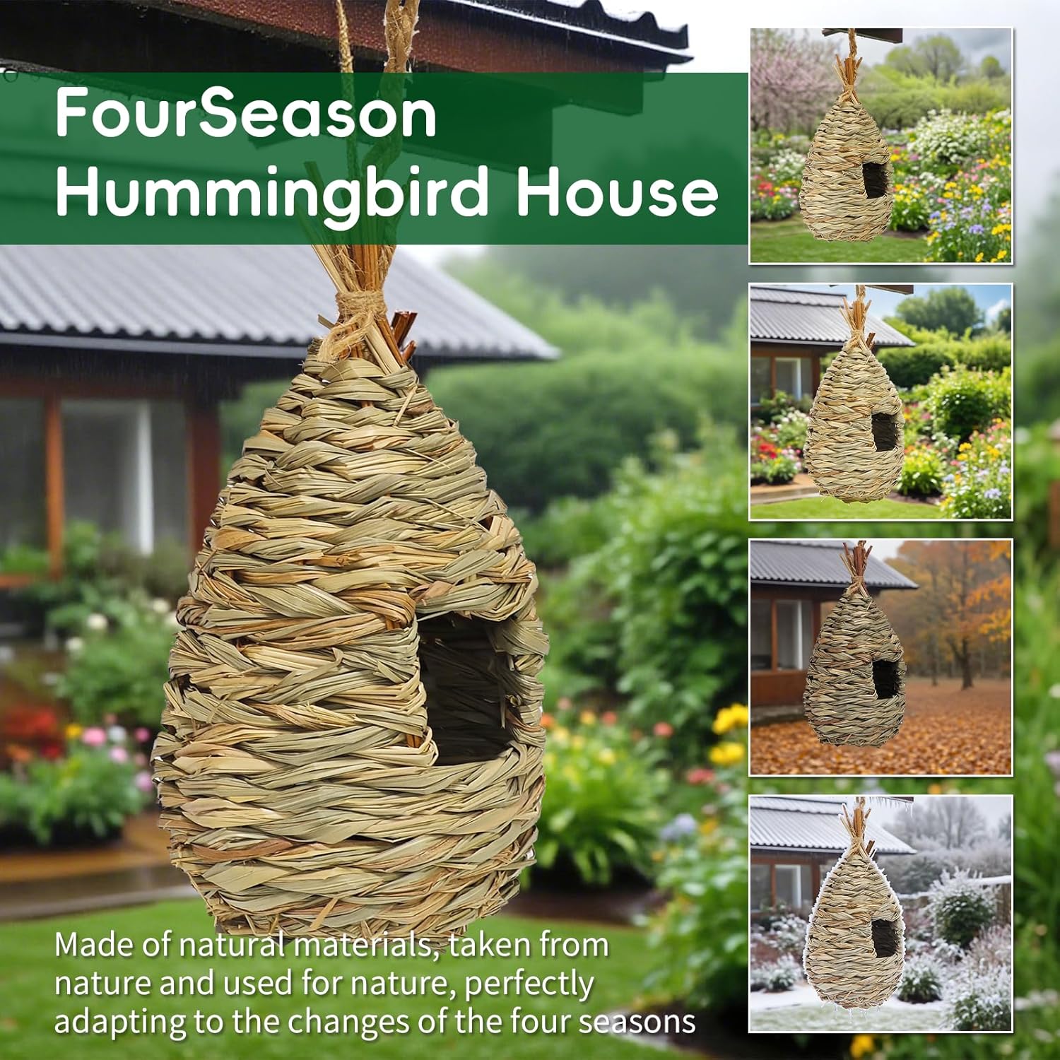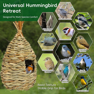 - EXTRA STURDY BIRD SHELTER Our large Humming bird houses for outside is durable whether it is open air, high temperature, wind blowing etc. With the strong hemp rope, you can hang our Grass HummingBird house on tree branches, vines or fences to provide a sheltered warm place for birds from cold biting winds, rain, snow or escaping predators