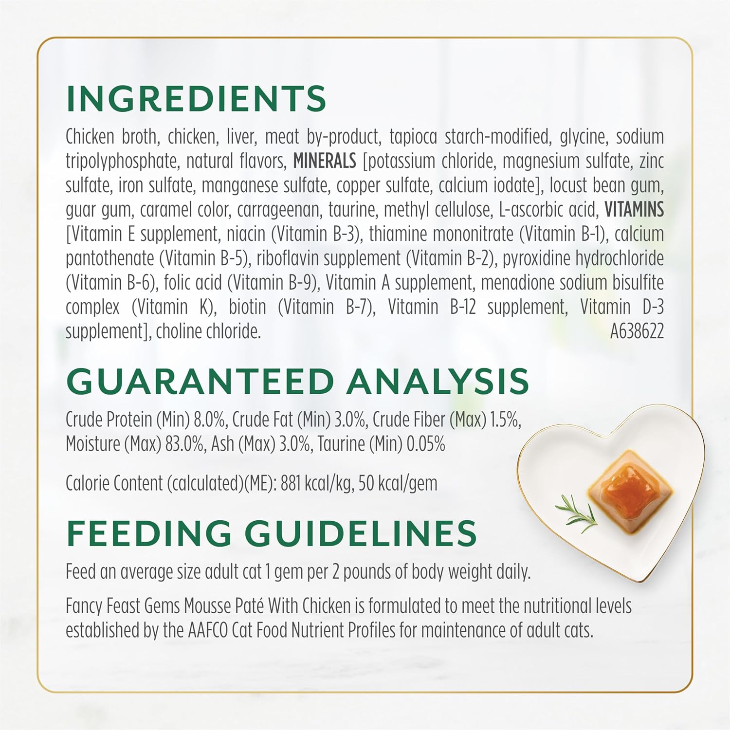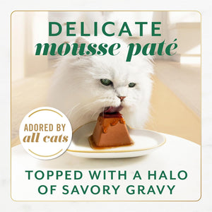 Details Introducing our most elevated mealtime experience yet Fancy Feast Gems Mousse with Chicken Wet Cat Food Pate With a Halo of Savory Gravy. This mouthwatering mousse cat food is topped with wet cat food gravy, creating a cascade of savory cat gravy that transforms mealtime into marvelous. Crafted with high-quality chicken, this pate wet cat food in a pyramid-shaped cat pate that makes eating delightful for cats. Each serving peels and plates easily with two servings in every pack to turn everyday into the extraordinary with our most exquisite eating experience yet. Your cat deserves a meal as unique as they are, so serve them a Fancy Feast Gems Pate today. Every Fancy Feast Wet Cat Food meal is thoughtfully crafted and tested for quality and safety in Purina-owned facilities. Feeding your cat is an opportunity to bring you and your cat closer together, which is why Fancy Feast has dedicated more than 30 years to developing gourmet recipes for cats and their owners to explore together.