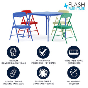 Details Create a space for your little ones in the classroom or home with the Flash Furniture Mindy Kids 5-Piece Folding Table and Chairs Set. This kids table set includes one square folding table and four folding chairs to provide the perfect place for young students and kids to enjoy snacks or meals, get creative with arts and crafts, read a book, or play educational games. The set is recommended for preschool through first grade aged children and is great for use in shared spaces in your daycare center, preschool, kitchen, bedroom, or playroom. The classroom table and chairs fold to store behind other furniture and inside closets. As an additional safety measure, a metal lever must be pushed in to unlock the table and chairs before they can fold to prevent unintended collapse. Simply push in the metal lever to unlock and then fold. Constructed from durable vinyl, the kids table and chairs set withstands years of quality use. The children's table measures 24" W x 24" D x 20.25" H and holds up to 70 pounds of static weight. Each small chair measures 12.5" W x 13.5" D x 21.25" H with a 10.5" W x 10.5" D x 12.25" H seat size, 12.5" W x 10" H back size, and 13" W x 1.25" D x 21.25" H folded size and holds up to 81 pounds of static weight.