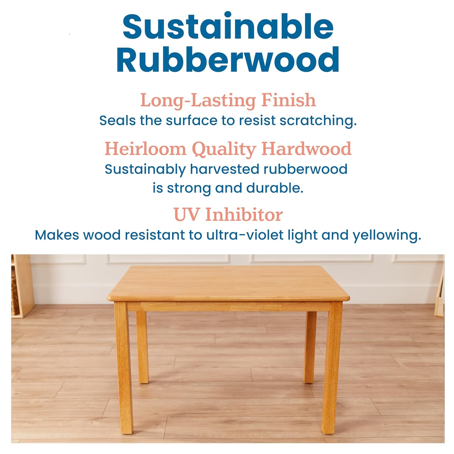 Details Product DescriptionEnhance any classroom, playroom, or daycare with ECR4Kids 24 x 36" Rectangular Hardwood Table, designed for use by children. This child-sized table is more than a piece of kids' furniture, it's a tool that fosters student confidence and independence. Providing a dedicated workspace encourages young learners to focus and cultivate positive work habits. This activity table is ideal for a range of activities like arts and crafts or collaborative learning projects. It's crafted with child safety and inclusivity in mind, integrating seamlessly into Montessori and Waldorf settings to enrich educational and play areas. Little ones take ownership of their learning in a kid-sized environment, where tables appropriately sized let them enjoy books, snacks, or seated rest in comfort and confidence. Constructed from rubberwood with a durable finish sealing the wood surface and resisting scratching. A UV inhibitor helps furniture resist ultraviolet light and yellowing. Table legs feature non-marring nylon glides to protect floors from scratching and scuffing. Pair with ECR4Kids Three Rung Ladderback chairs for the most comfortable school or home set-up; sold separately.Set Contains24in x 36in Rectangular Hardwood Table with 22in Legs