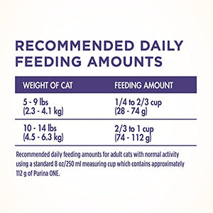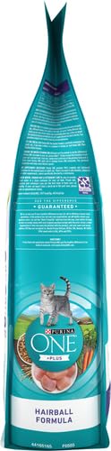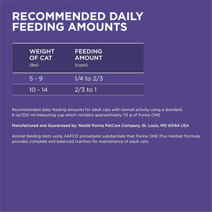 Details Use the combined power of nature and research to get results you can see with Purina ONE +PLUS Hairball Formula adult dry cat food. This easily digestible recipe includes a SmartBlend of high-quality ingredients. The hairball control cat food starts with real chicken as the number 1 ingredient and has 38 grams of protein per cup, helping to support her strong muscles. A natural fiber-rich blend helps minimize and control hairballs, and four antioxidant sources in this hairball cat food help support her strong immune system. This natural cat food recipe with added vitamins, minerals and nutrients delivers 100 percent complete and balanced nutrition for your adult cat. With 100 percent nutrition and 0 percent fillers, every ingredient has a purpose. Our high fiber cat food is crafted as part of a veterinarian-recommended brand to give you the confidence of knowing that you are offering a premium cat food.
