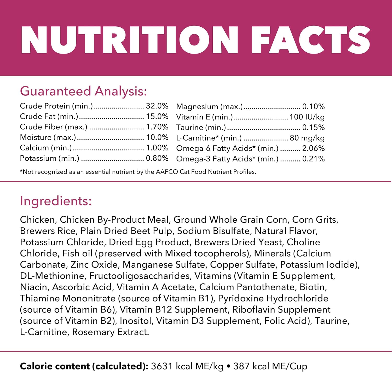 Details Mealtime matters. IAMS Proactive Health Adult Urinary Tract Health Dry Cat Food with Chicken is an everyday meal thats 100% complete and balanced to help adult cats stay on the path to health. This wholesome, tasty recipe is made with real chicken and healthy ingredients that provide essential nutrients for your adult cat. These essential nutrients, like potassium and calcium, can help nourish a healthy heart for your feline friend. As an added benefit, Omega 6 and 3 fatty acids in this adult cat food help nourish your cats skin, and promote a glossy, vibrant coat. Help keep your cat healthy, happy, and playful for life with tailored nutrition from the IAMS brand.