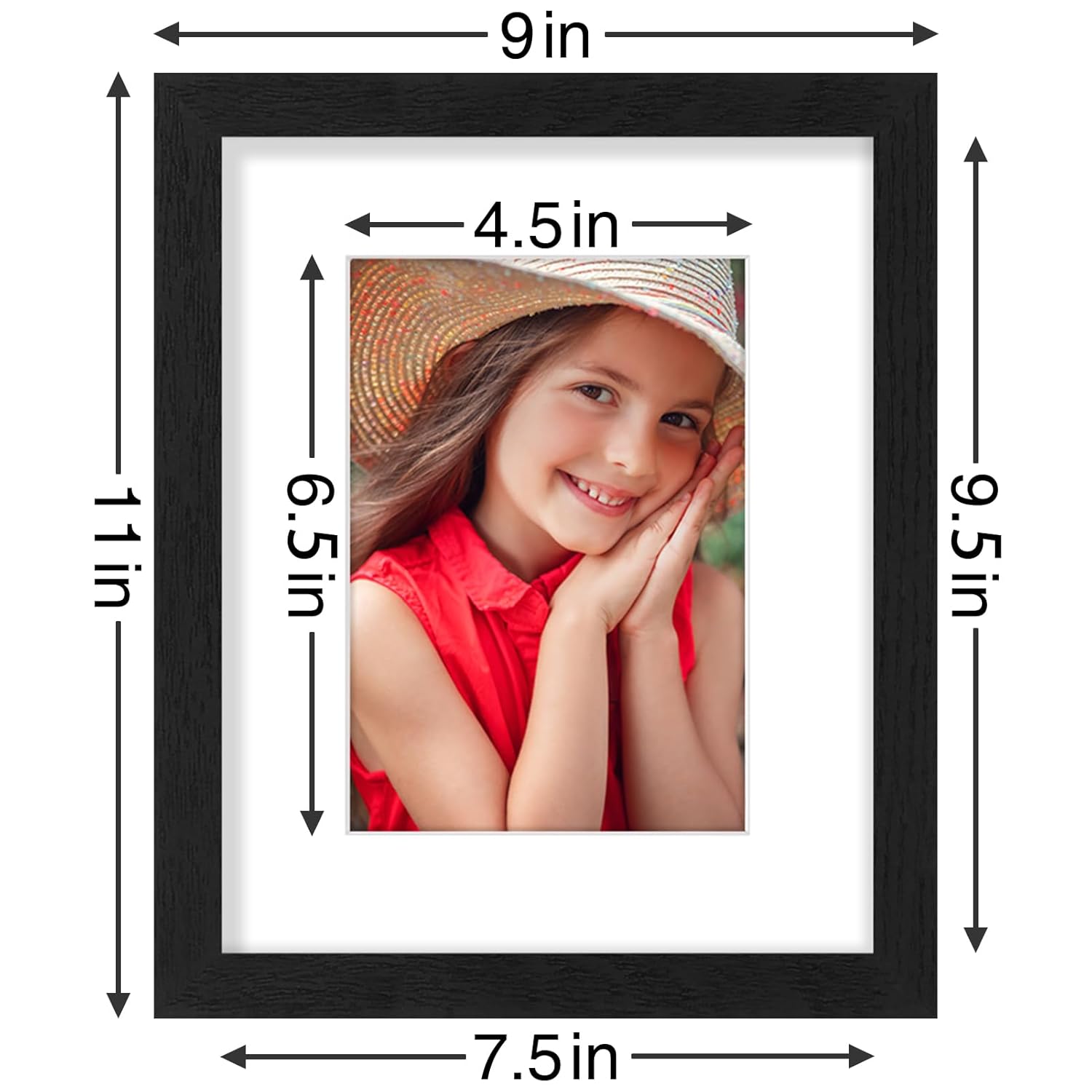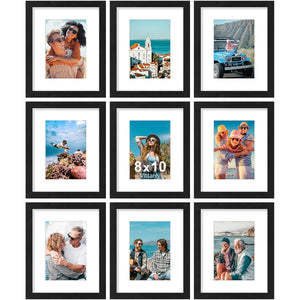 Vittanly 8x10 Picture Frames Set of 9, Shatter Resistant Plexiglass, Display 5x7 Pictures with Mat or 8x10 without Mat, Photo Frames for Wall or Tabletop, Engineered Wood, Black