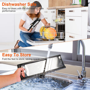 - *Space Saving Food Slicer*: The blades are built-in and do not take up extra space. The non-slip feet can be folded for easy storage in a drawer,saving space.