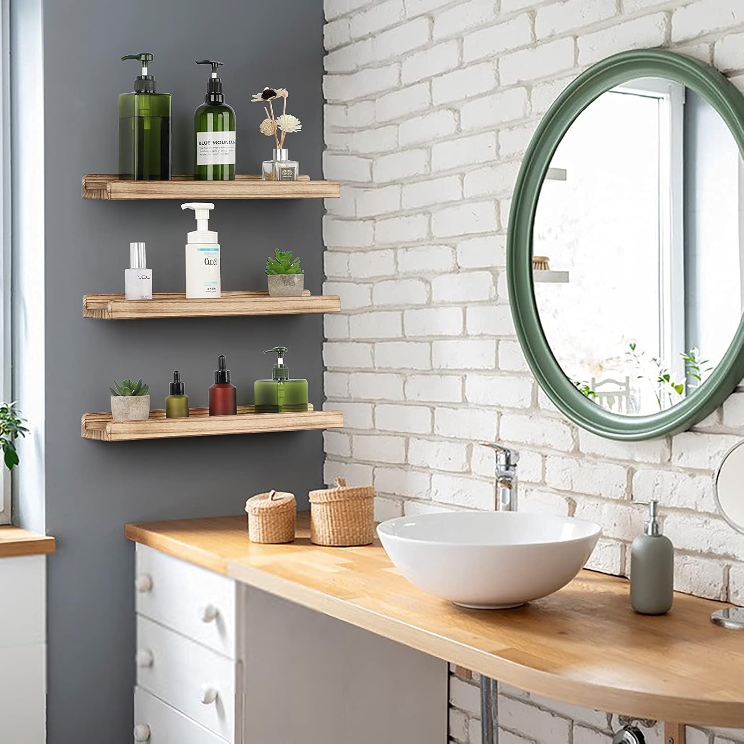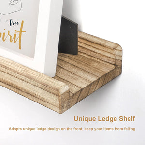 - Rustic Wood Display Shelves Our floating shelf for wall offer adequate storage space, you can clear the clutter by organizing them on the wall without taking up much space. You can also hang them separately to display books, picture frames, plants, tidy up jars, bottles, bathing articles, or other items in the bathroom, bedroom, kitchen, living room. The front lip on the floating shelf can prevent items from falling off or sliding forward